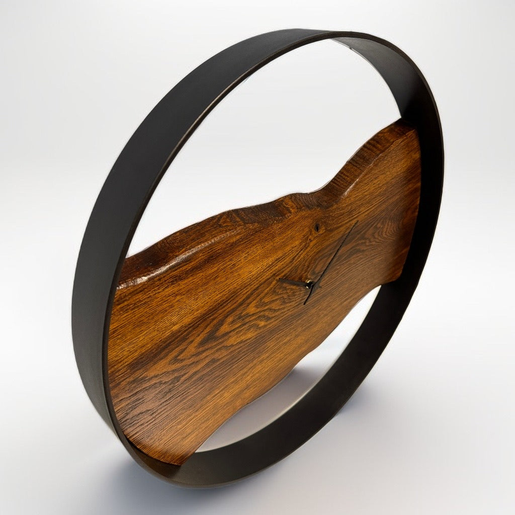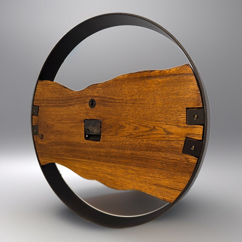 Der massive Außenring aus Stahl, schwarz pulverbeschichtet, bildet einen kraftvollen Kontrast zur warmen, lebendigen Maserung der massiven Eiche im Inneren. Das Ergebnis: eine Uhr, die nicht nur die Zeit zeigt, sondern als stilvolles Designobjekt jeden Raum aufwertet.